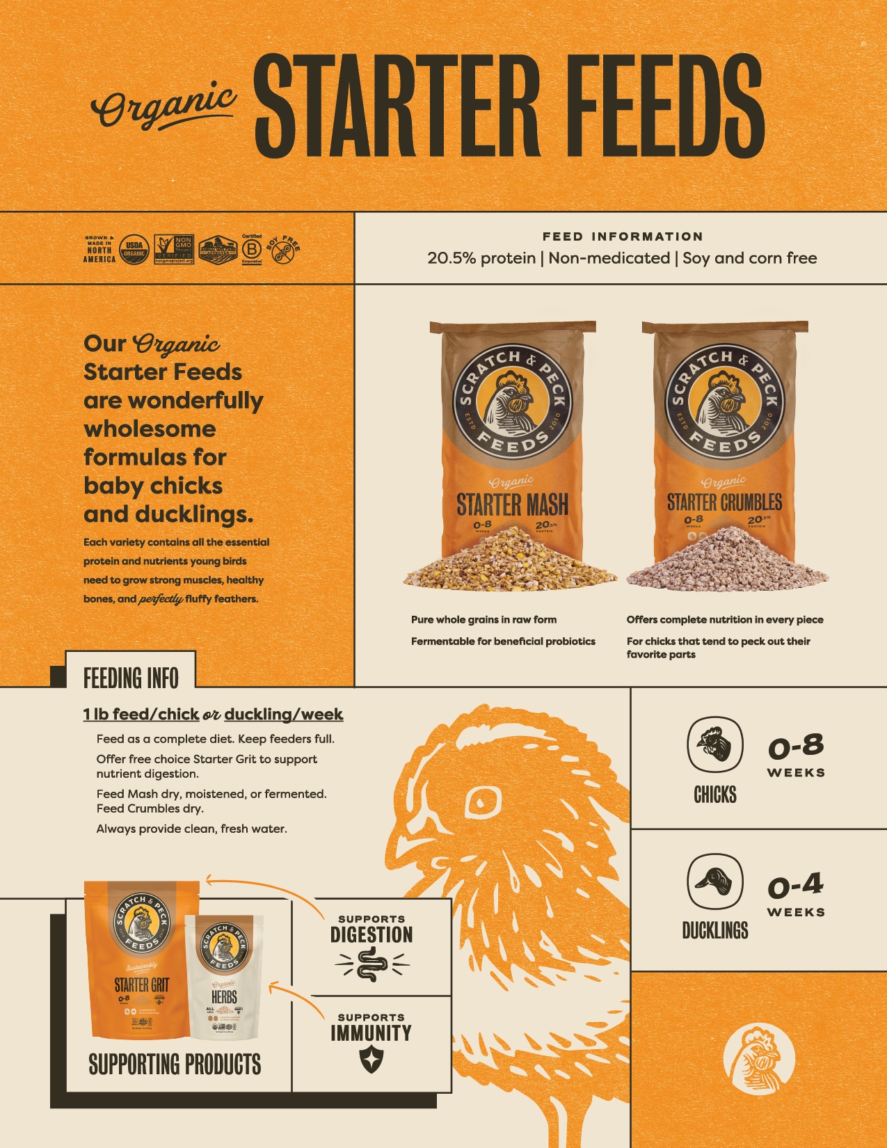 Complete organic nutrition for baby chicks and ducklings. Starter Crumbles and Starter Mash both support strong muscles, healthy bones, and fluffy feathers, while starter grit aids digestion and organic herbs help boost natural immunity.