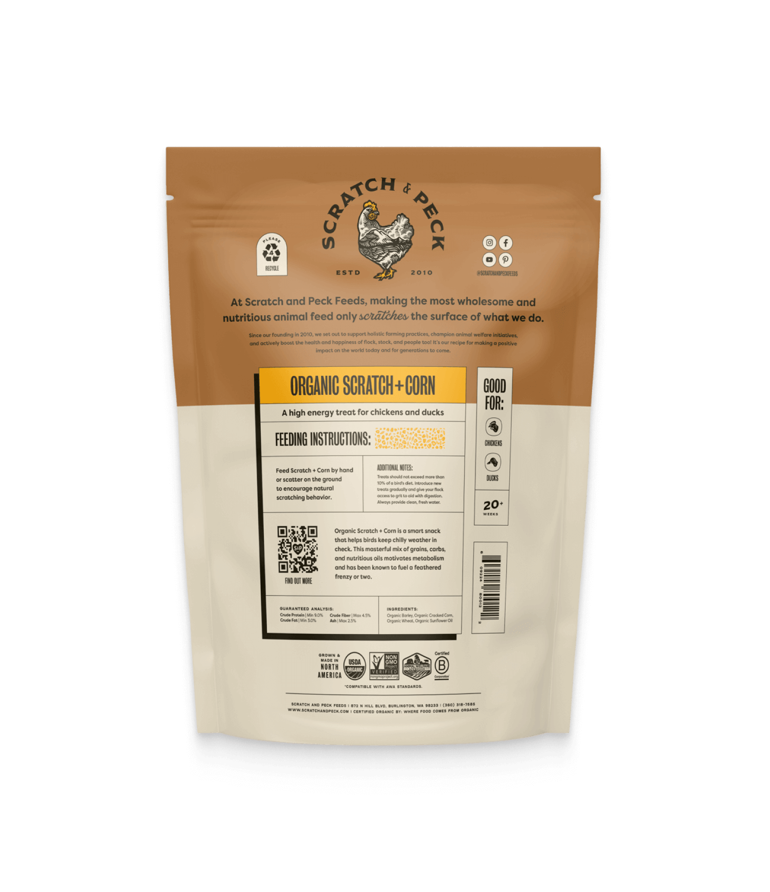 Feed Organic Scratch + Corn by hand or scatter on the ground to encourage natural scratching behavior.